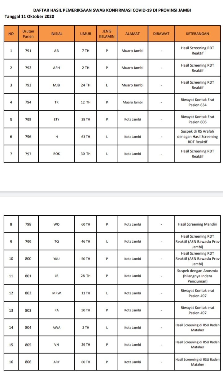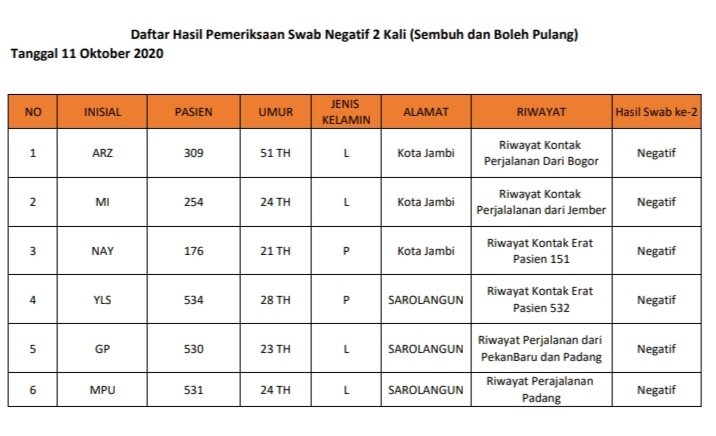 "Dan hari ini, ada juga penambahan pasien sembuh sebanyak 6 orang yang berasal dari Kota Jambi dan Sarolangun," tambahnya.
