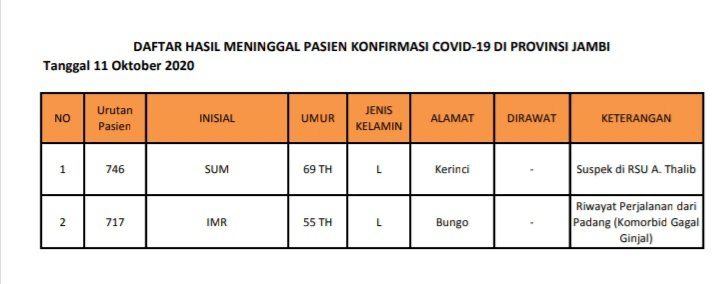 Kemudian Johansyah juga menjelaskan, kalau hari ini ada 2 pasien Corona yang meninggal dunia, diantaranya pasien 746 asal Kerinci dan pasien 717 asal Bungo.