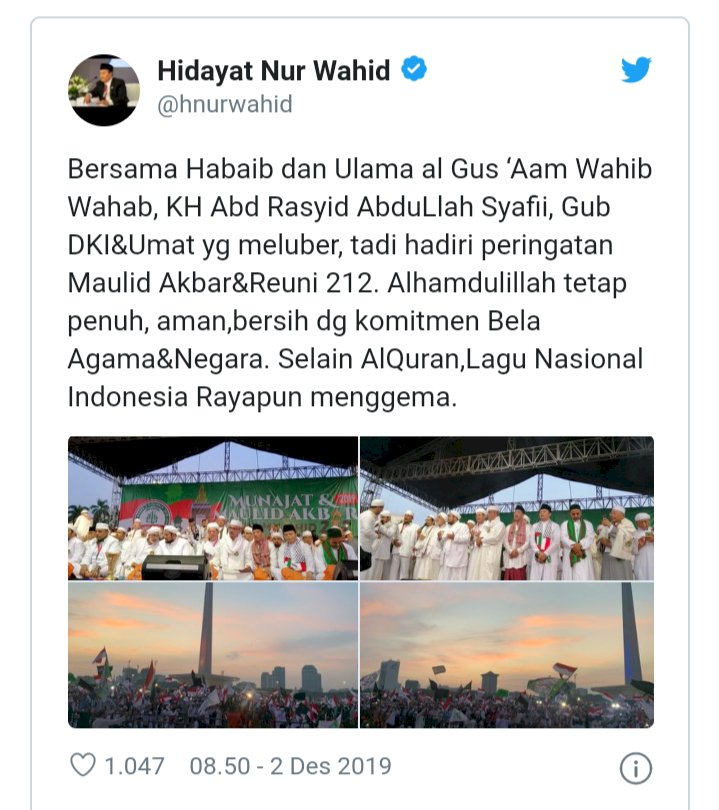 "Bersama Habaib dan Ulama al Gus ‘Aam Wahib Wahab, KH Abd Rasyid AbduLlah Syafii, Gub DKI&Umat yg meluber, tadi hadiri peringatan Maulid Akbar&Reuni 212. Alhamdulillah tetap penuh, aman,bersih dg komitmen Bela Agama&Negara. Selain AlQuran,Lagu Nasional Indonesia Rayapun menggema," tulis @Hnurwahid.
