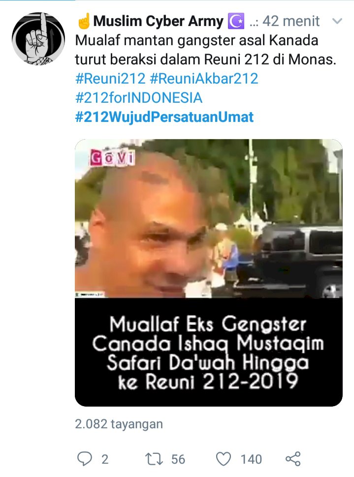 Begitu juga cuitan Lainnya, Mualaf mantan gangster asal Kanada turut beraksi dalam Reuni 212 di Monas.