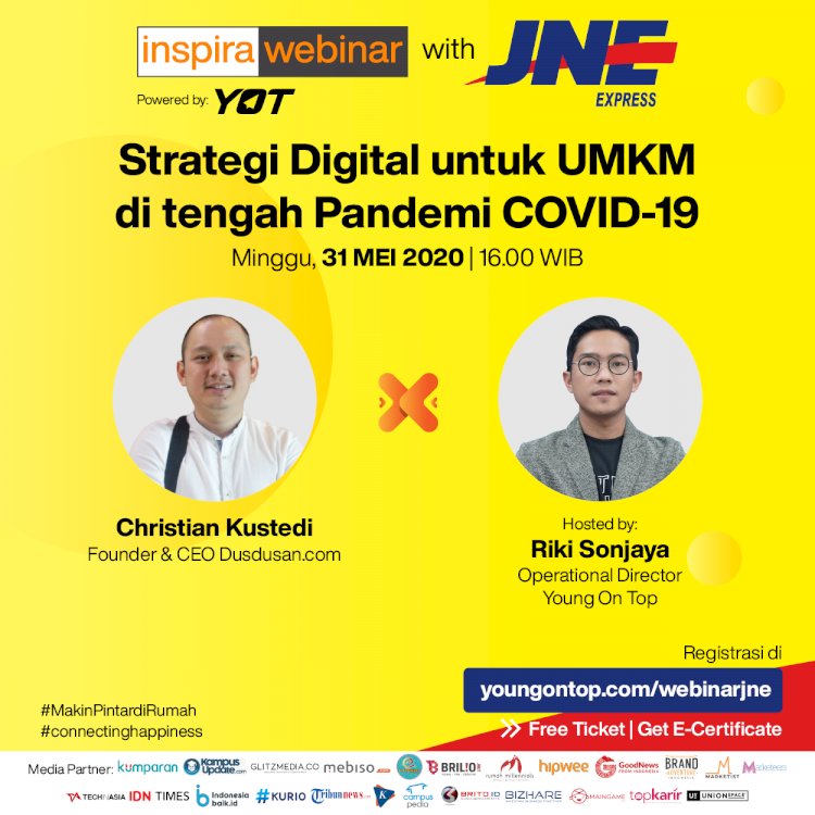 Selain itu, penting juga bagi UMKM untuk bisa beradaptasi dengan mempelajari strategi digital di tengah pandemik seperti saat ini, mengingat perubahan perilaku konsumen dari offline ke online terjadi sangat signifikan. Yuk bahas lebih dalam sama ahlinya di Inspira Webinar with JNE: ‘Strategi Digital untuk UMKM di tengah Pandemi Covid-19’ bareng Christian Kustedi, Founder & CEO Dusdusan.com, hari Minggu, 31 Mei 2020, pukul 16.00 WIB. Ini dia detail acaranya: