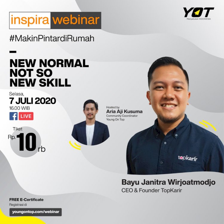 Cara ketiga adalah dengan ikutan webinar. Salah satunya adalah Inspira Webinar #MakinPintardiRumah dari Young On Top. Nah, ngomongin soal upgrade skill, kamu bisa ikutan Inspira Webinar bersama Mas Bayu Janitra Wirjoatmodjo, CEO & Founder TopKarir yang akan membahas 'New Normal Not So New Skill'. Di Inspira Webinar ini, Mas Bayu juga akan membahas skill apa aja yang harus kamu kuasai di era new normal ini.