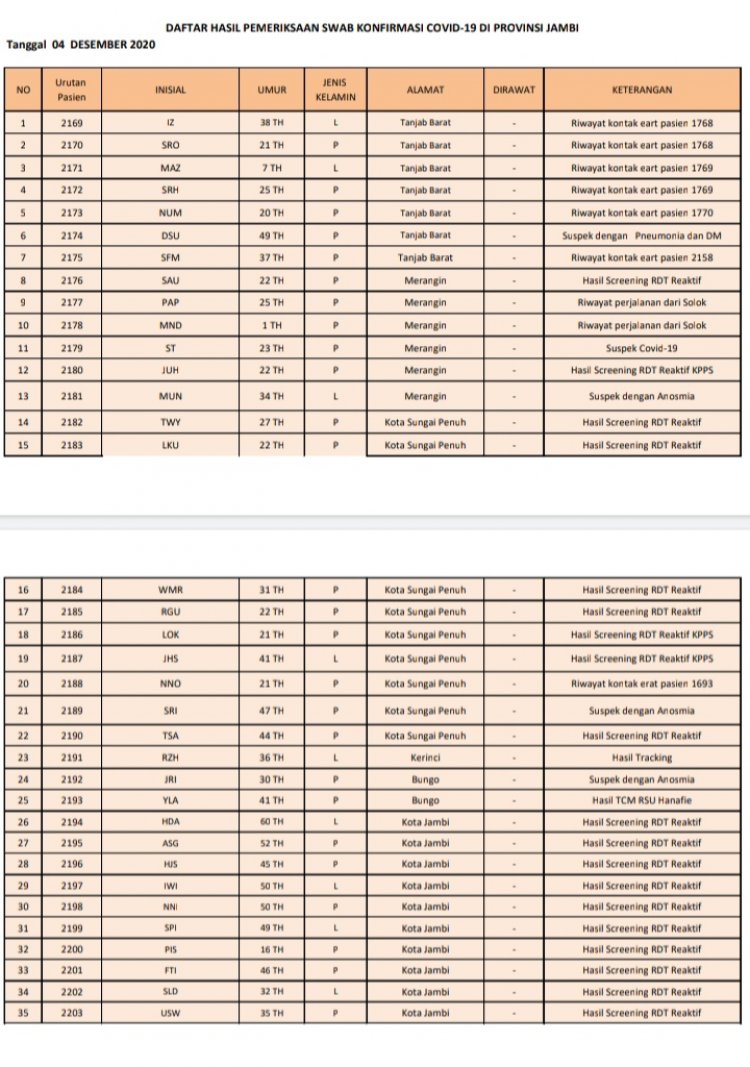 BRITO.ID, BERITA JAMBI- Penambahan kasus konfirmasi positif COVID-19 di Jambi terus mengalami penambahan. Bahkan selama tiga hari terakhir, kasus konfirmasi di Jambi selalu berada di atas 50 kasus tiap harinya. Dua hari terakhir, terjadi penambahan 81 dan 94 kasus, hari ini Jum'at 4 Desember 2020, sebanyak 55 orang di Jambi dinyatakan positif terpapar COVID-19.