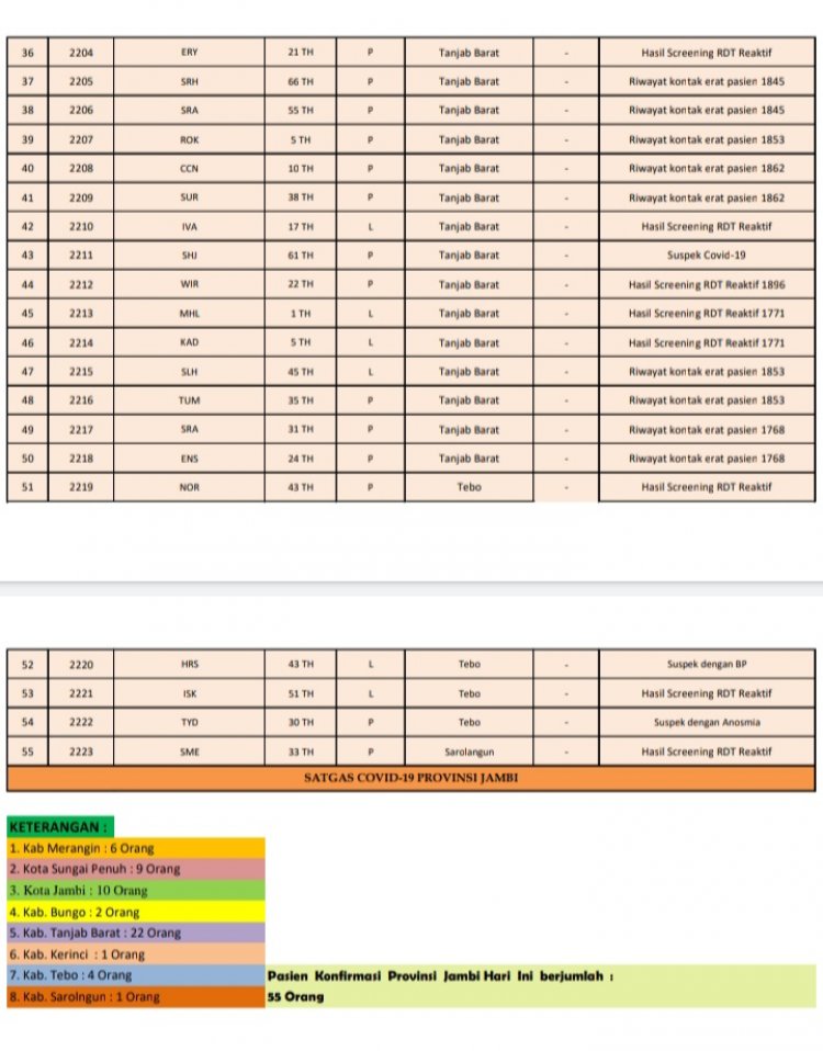 Dengan penambahan 55 kasus konfirmasi hari ini, total secara kunjlatif hingga saat ini 2.223 orang di Jambi terpapar Corona. Untuk itu, Tum Satgas meminta dan mengajak seluruh masyarakat di Jambi untk selalh mematuhi protokol kesehatan.