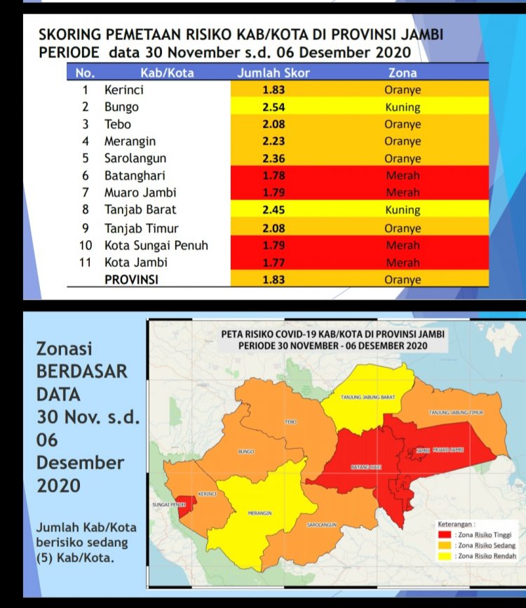 Kemudian skoring pemetaan risiko periode 30 November-6 Desember empat kabupaten masuk zona merah yakni Batanghari, Muarojambi, Kota Jambi dan Sungaipenuh. Hanya dua zona kuning Bungo dan Tanjabbar, sementara sisanya zona orange.