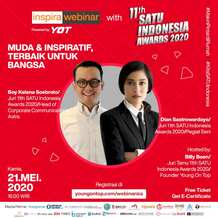 Banyak cara lain untuk mendapatkan inspirasi, salah satunya adalah dengan ikutan Webinar. Nah, kalo kamu mau jadi anak muda yang inspiratif, kamu bisa ikutan Inspira Webinar with 11th SATU Indonesia Awards 2020: ‘Muda & Inspiratif, Terbaik untuk Bangsa’ bareng Dian Sastrowardoyo dan Boy Kelana Soebroto, hari Kamis, 21 Mei 2020, pukul 16.00 WIB. Ini dia detail acaranya: