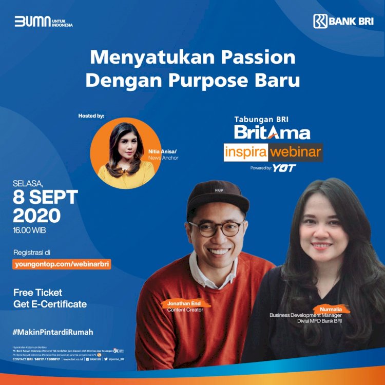 YOTers mau lebih dalam lagi bahas gimana cara menyelaraskan passion dan purpose? Yuk ngobrol langsung di Inspira Webinar #MakinPintardiRumah with Bank BRI: ‘Menyatukan Passion dengan Purpose’ bareng Jonathan End, Content Creator, dan Nurmalia, Business Development Manager Divisi MFD Bank BRI, hari Selasa, 8 September 2020, pukul 16.00 WIB. Ini dia detail acaranya: