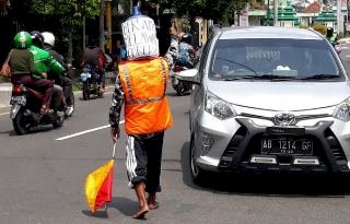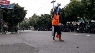 Dengan mengenakan rompi berwarna oranye, celana panjang warna hitam dan galon bekas di kepalanya, Ali tampak sibuk mengatur lalin di simpang 3 Jalan Tamansiswa, Kecamatan Mergangsan, Kota Yogyakarta.