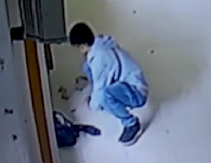 Sejurus kemudian, ia mengangkat membongkar kotak amal dan menguras dengan cepat kotak amal serta bergegas meninggalkan lokasi.