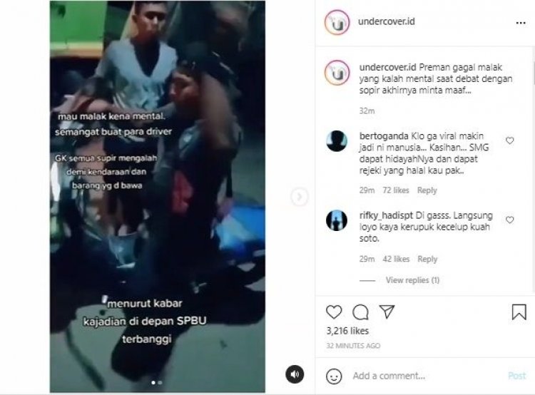 "Preman gagal malak yang kalah mental saat debat dengan sopir, akhirnya minta maaf," tulis @undercover.id sebagai keterangan Instagram seperti dikutip m, Sabtu (31/7/2021).