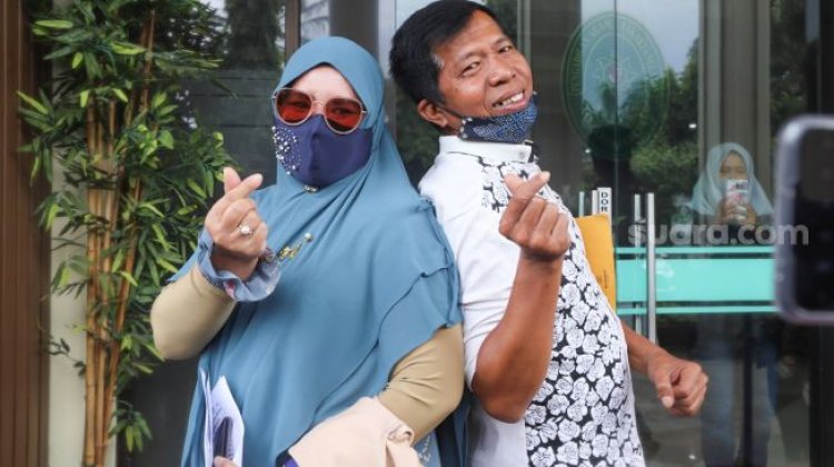 Komedian Kiwil dan Istri pertamanya, Rochimah berpose didepan kamera ketika ditemui usai menjalani sidang cerai di Pengadilan Agama Jakarta Selatan, Rabu (10/2/2021). [Suara.com/Alfian Winanto]