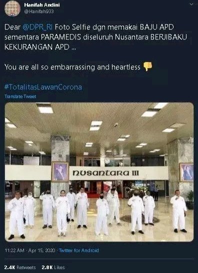 "Dear @DPR_RI foto selfie dengan memakai baju APD, sementara paramedis di seluruh nusantara berjibaku kekurangan APD. Your are all embarrassing and heartless (Kalian sangat memalukan dan tidak punya hati --red)," tulis @Hanifah933, seperti dikutip Suara.com, Kamis (16/4).