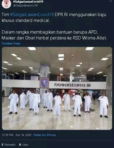 Dari hasil penelusuran Suara.com, foto anggota DPR yang diklaim warganet memakai APD juga dibagikan oleh akun @Satgaslwanco19.