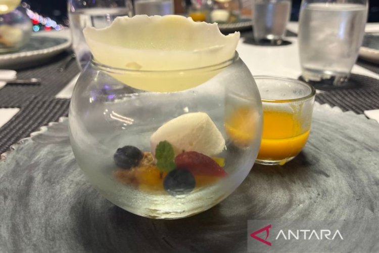 Ketika memegang gelas berisi es krim vanila dengan potongan buah bluberi yang segar, gelas terasa dingin. Rupanya, yang dimaksud adalah gelas kecil berisi saus mangga yang hangat.