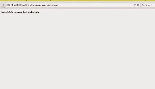 Buka browser Anda, klik "file" lalu "open file" cari file websiteku.htm yang sudah Anda buat, maka browser akan menampilkan seperti gambar di bawah :