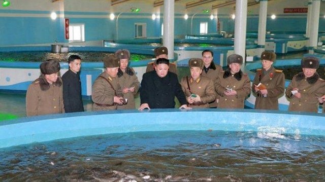 Kim Jong Un menyaksikan kolam berisi ikan piranha. (4plebs.com)