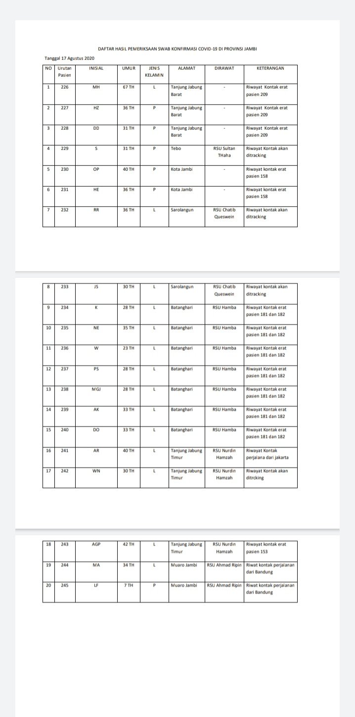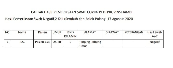 Berikut Identitas pasien yang dinyatakan sembuh di Jambi: