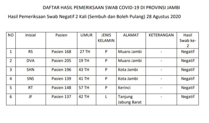 Adapun pasien terkonfirmasi positif hari ini berasal dari Kabuoaten Kerinci dan Bungo.