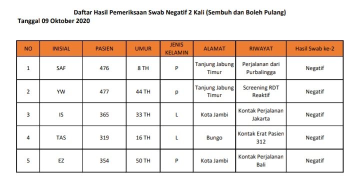 Dari sebaran Corona yang diupdate Gugus Tugas Penanganan Covid-19 Provinsi Jambi hari ini, Jumat (9/10/2020), penambahan pasien positif mencapai 45 orang. Kemudian ada 2 pasien yang dinyatakan meninggal, dan terakhir penambahan pasien sembuh sebanyak 5 orang.