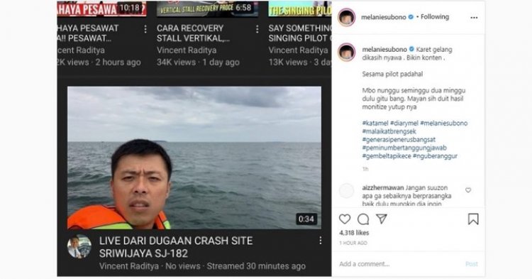 Dalam unggahan itu, ia juga menunjukkan tangkapan layar konten YouTube Vincent Raditya yang berjudul "Live dari Dugaan Crash Site Sriwijaya SJ-182".