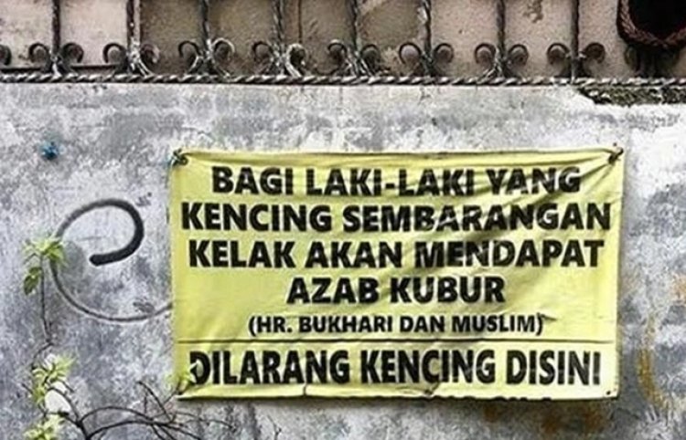 Larangan ini dibuat tentu untuk mendisiplinkan orang agar tidak kencing sembarangan. Selain menimbulkan aroma tak sedap, juga membuat tanaman disekitar jadi mati karena air seni.