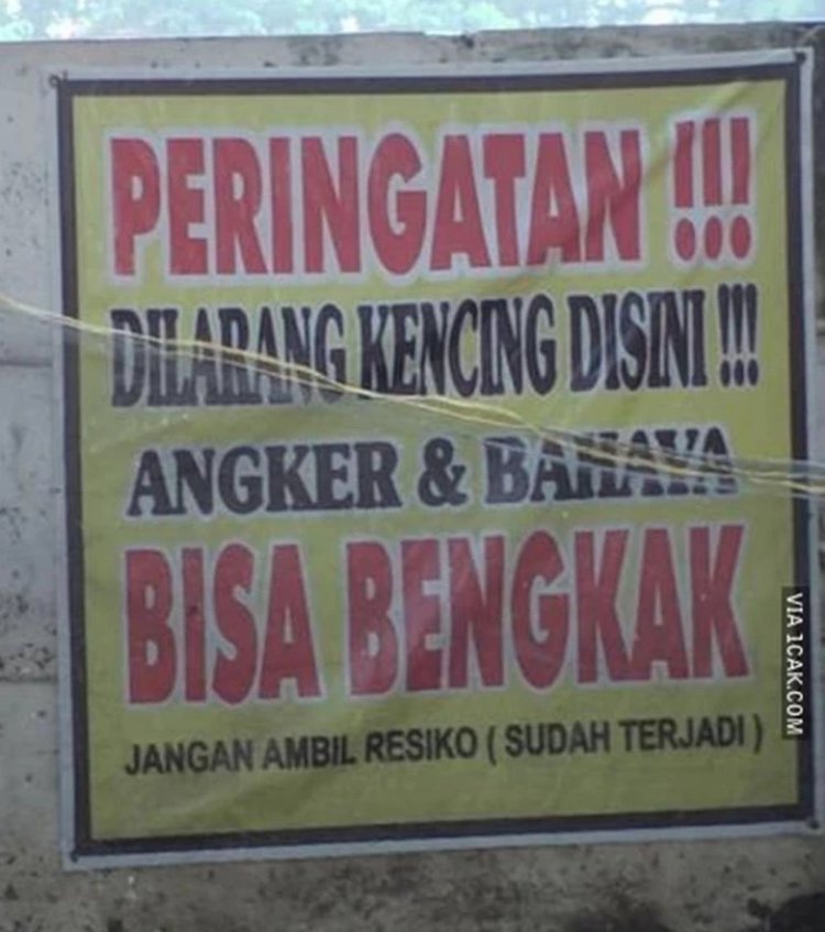 Untuk memberikan efek jera, larangan tersebut bahkan dibuat dengan kalimat yang absurd dan kocak. Biar nggak penasaran, simak potret lengkap berikut yang brilio.net kumpulkan dari 1cak, pada Minggu (11/4).