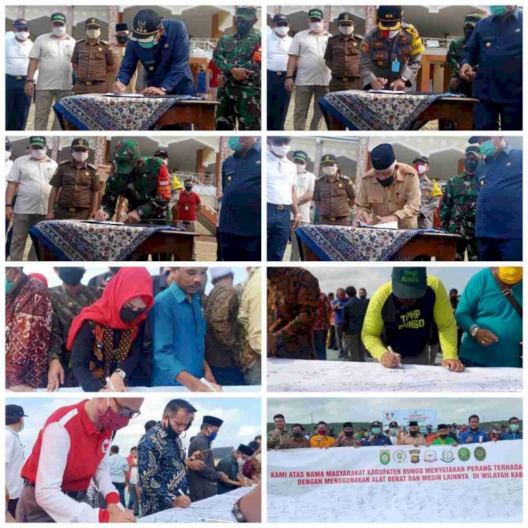 BRITO.ID, BERITA BUNGO - Pemerintah Kabupaten Bungo bersama insur Forkopimda, beserta lembaga adat, 17 Kecamatan yang berada didalam Kabupaten Bungo, Datuk Rio, Ketua BPD, lembaga di Dusun, mahasiswa, deklarasi dan penandatanganan Fakta integritas tolak penambang emas tanpa izin (PETI) di Kabupaten Bungo.