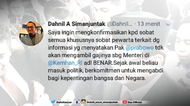 "Saya ingin mengkonfirmasikan kepada sobat semua khususnya sobat pewarta terkait dengan informasi yang menyatakan Pak Prabowo tidak akan mengambil gajinya sebagai Menteri di Kemhan adalah benar. Sejak awal beliau masuk politik, berkomitmen untuk mengabdi bagi kepentingan bangsa dan Negara," jelas Dahnil dalam akun Twitternya, Rabu (30/10). (RED)