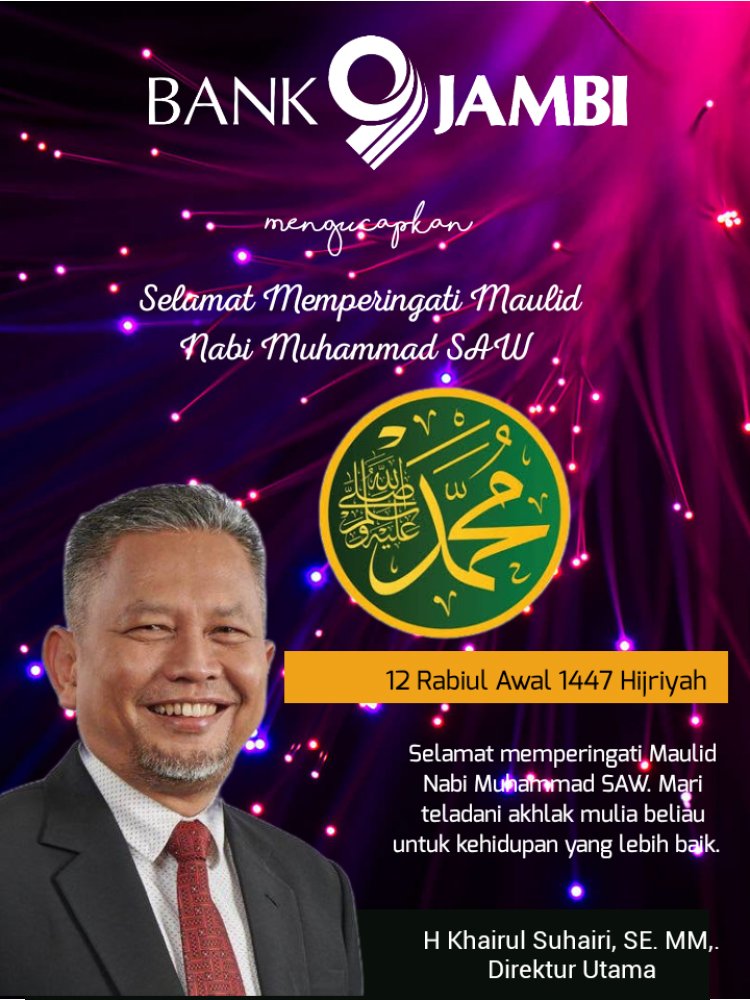 BRITO.ID, BERITA JAMBI – Peringatan Maulid Nabi Muhammad SAW menjadi momentum penting bagi umat Islam untuk kembali meneladani akhlak mulia Rasulullah dalam kehidupan sehari-hari. Hal ini disampaikan oleh Direktur Utama Bank 9 Jambi, Khairul Suhairi, SE, MM, dalam pesannya kepada masyarakat.