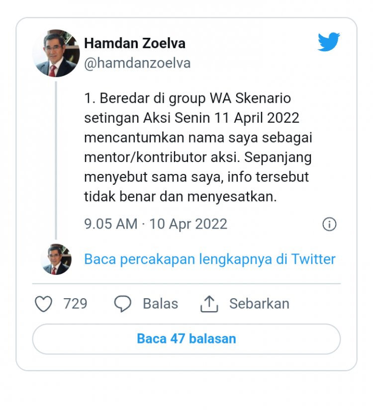 "Sepanjang menyebut nama saya, info tersebut tidak benar dan menyesatkan," kata Hamdan dalam akun Twitter resminya @hamdanzoelva dikutip Senin (11/4).