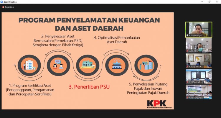 Guna memantau kemajuan penertiban Prasarana, Sarana, dan Utilitas (PSU) di sejumlah Pemerintah Kabupaten dan Kota se-Provinsi Jambi, Komisi Pemberantasan Korupsi (KPK) melalui Direktorat Koordinasi dan Supervisi (Korsup) Wilayah I menggelar rapat koordinasi (rakor) dengan Sekretaris Daerah, Inspektur, dan Kepala Pertanahan di wilayah itu, yang berlangsung secara daring, Rabu, 17 Februari 2021.