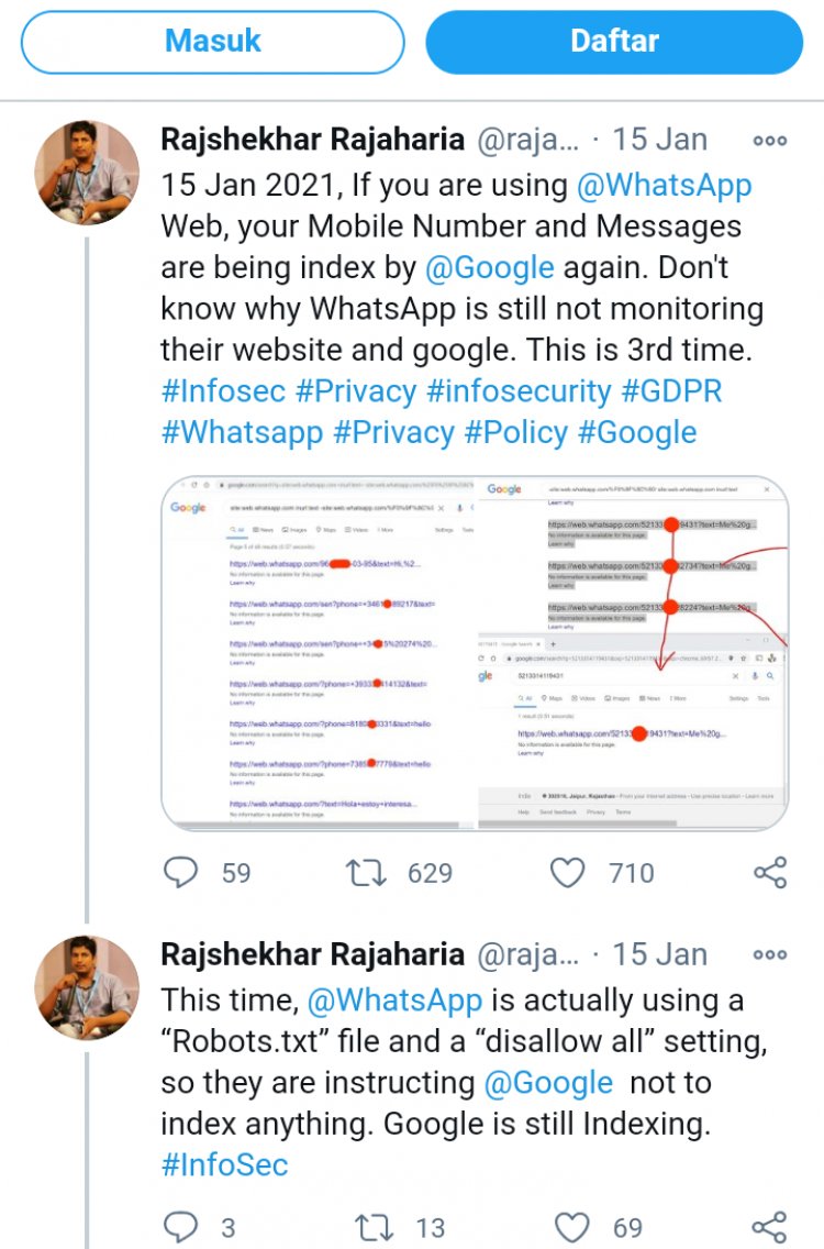 "15 Januari 2021, Jika kalian menggunakan WhatsApp Web, nomor telepon kalian bakal terindeks di Google lagi. Tidak diketahui kenapa WhatsApp masih tidak memonitor website mereka dan juga Google," tulis Rajaharia melalui akun Twitter pribadinya.