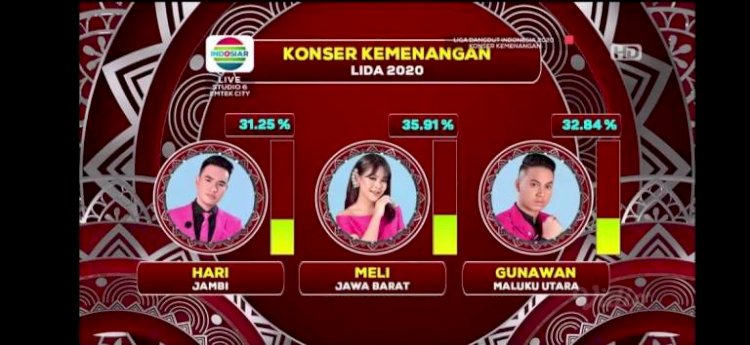 Konser final LIDA 2020 kali ini Hari hanya mendapatkan 31,25 persen, Gunawan mendapatkan 32,84 dan Meli mendapatkan 35,91 persen.