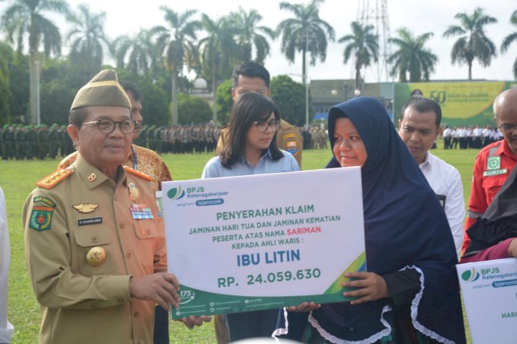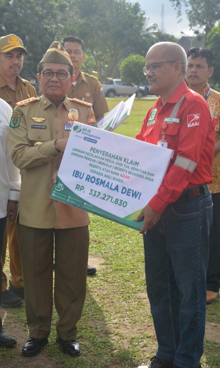 Gubernur Jambi dalam Peringatan Bulan K3 Tahun 2020 berkesempatan menyerahkan santunan manfaat Jaminan Kecelakaan Kerja Meninggal dari BPJS Kesehatan Kantor Cabang Jambi kepada;