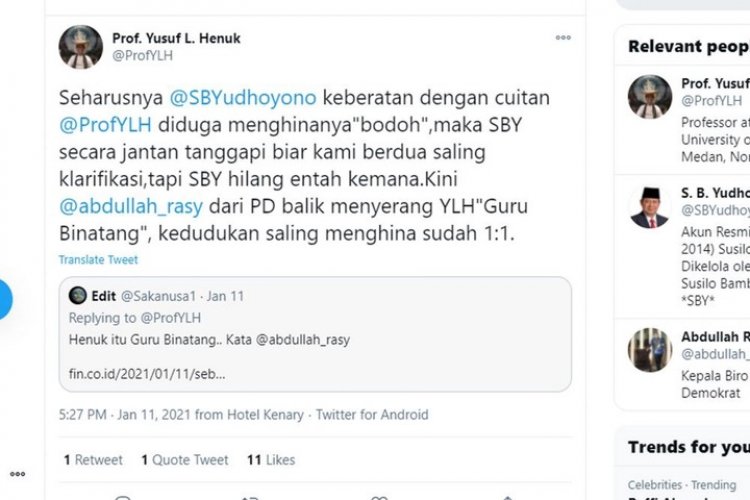 Guru Besar Unversitas Sumatra Utara (USU) Prof Yusuf Leonard Henuk membuat kontroversi di dunia maya. Cuitannya di Twitter, menyinggung nama Ketua Umum Demokrat Agus Harimurti Yudhoyono (AHY) dan Sang Ayah Susilo Bambang Yudhoyono (SBY).