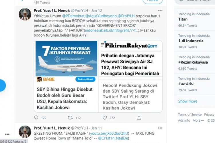 " YthKetua Umum @ PDemokrat, @AgusYudhoyono, @ProfYLH udah harus buktikan memang kau BODOH sekali, karena sepanjang sejarah jatuhnya pesawat di Indonesia tak pernah ada" GOVERNMENT ERROR "penyebabnya. Tapi" 7 FAKTOR "(http://indonesiabaik.id/infografis /7-faktor-penyebab-jatuhnya-pesawat).Maaf kau bodoh turunan, belajar lagi AHY!,” ujar Yusuf dalam cuitannya pada 12 Januari 2021 pagi.