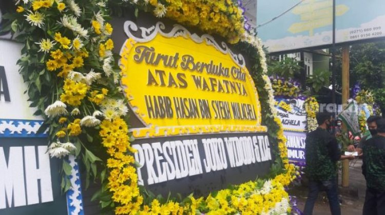 Deretan karangan bunga ucapan bela sungkawa pun terlihat berjejer di halaman kediaman Habib Hasan di Jalan Kyai Mojo 108, Pasar Kliwon, Solo hingga ke seberang jalan.
