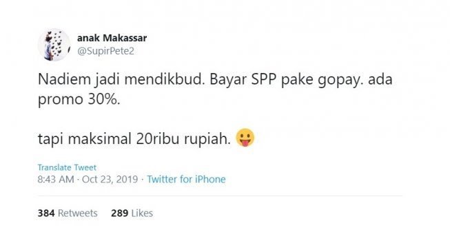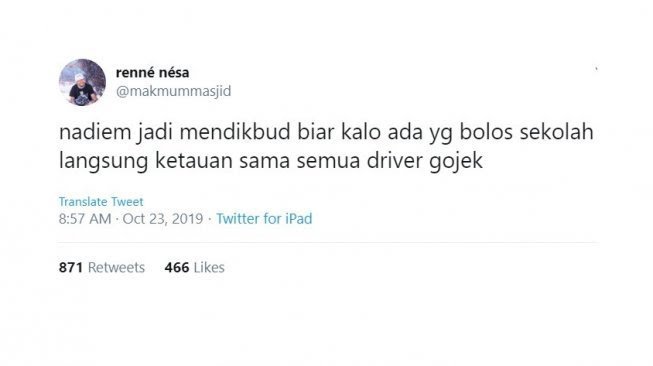 Sebelumnya, warganet sempat mencuitkan tweet berisi guyonan serupa mengenai Nadiem Makarim setelah diketahui dipanggil ke Istana Negara untuk menjadi calon menteri. Kini, setelah posisinya diumumkan sebagai Menteri Pendidikan dan Kebudayaan, tak sedikit warganet yang menyangkutpautkan posisinya saat ini dengan jabatannya sebagai mantan CEO Gojek.