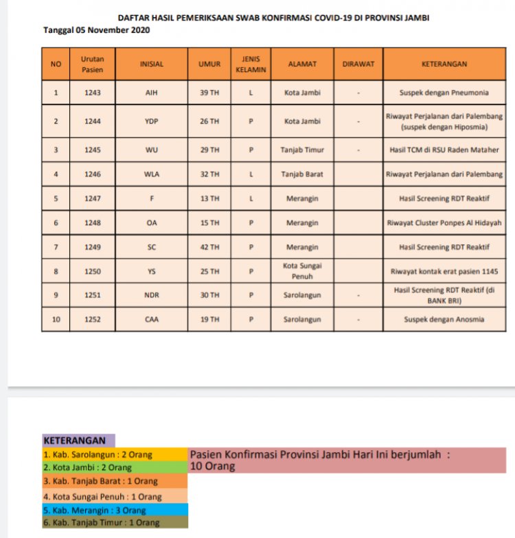 BRITO.ID, BERITA JAMBI - Sebanyak 22 orang warga Provinsi Jambi hari ini, Kamis (5/11) dinyatakan sembuh dari Corona Virus Disease 19 (Covid-19). Hal ini berdasarkan data yang dirilis oleh Satuan Tugas (Satgas) Provinsi Jambi. Sementara turut pula penambahan terkonfirmasi positif sebanyak 10 orang.