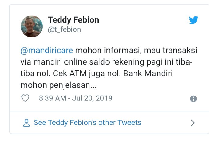 Nasabah lain mengatakan saldo rekening di tabungannya mendadak tak tersisa, alias nol. Pemilik akun @t_febion mengutarakan ia kaget ketika layar ATM menunjukkan saldo rekeningnya nol.