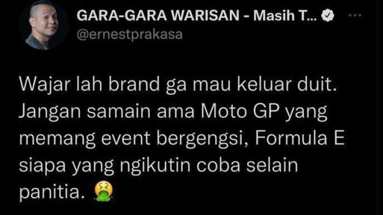 "Wajar lah brand ga mau keluar duit. Jangan samain ama Moto GP yang memang event bergengsi, Formula E siapa yang ngikutin coba selain panitia," tulis Ernest.