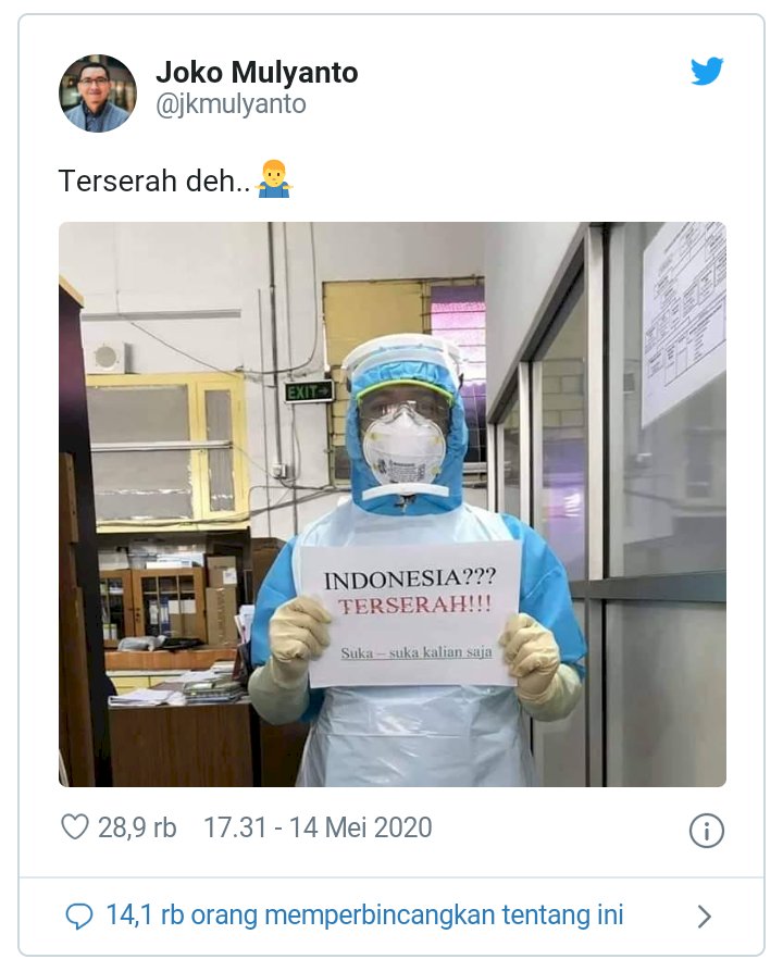 Pakar kesehatan masyarakat Universitas Jenderal Soedirman, Purwokerto, Jawa Tengah, Joko Mulyanto, turut membagikan satu foto tenaga kesehatan yang memegang kertas bertuliskan "Indonesia terserah, suka-suka kalian" di akun Twitter-nya, hari Kamis (14/05).