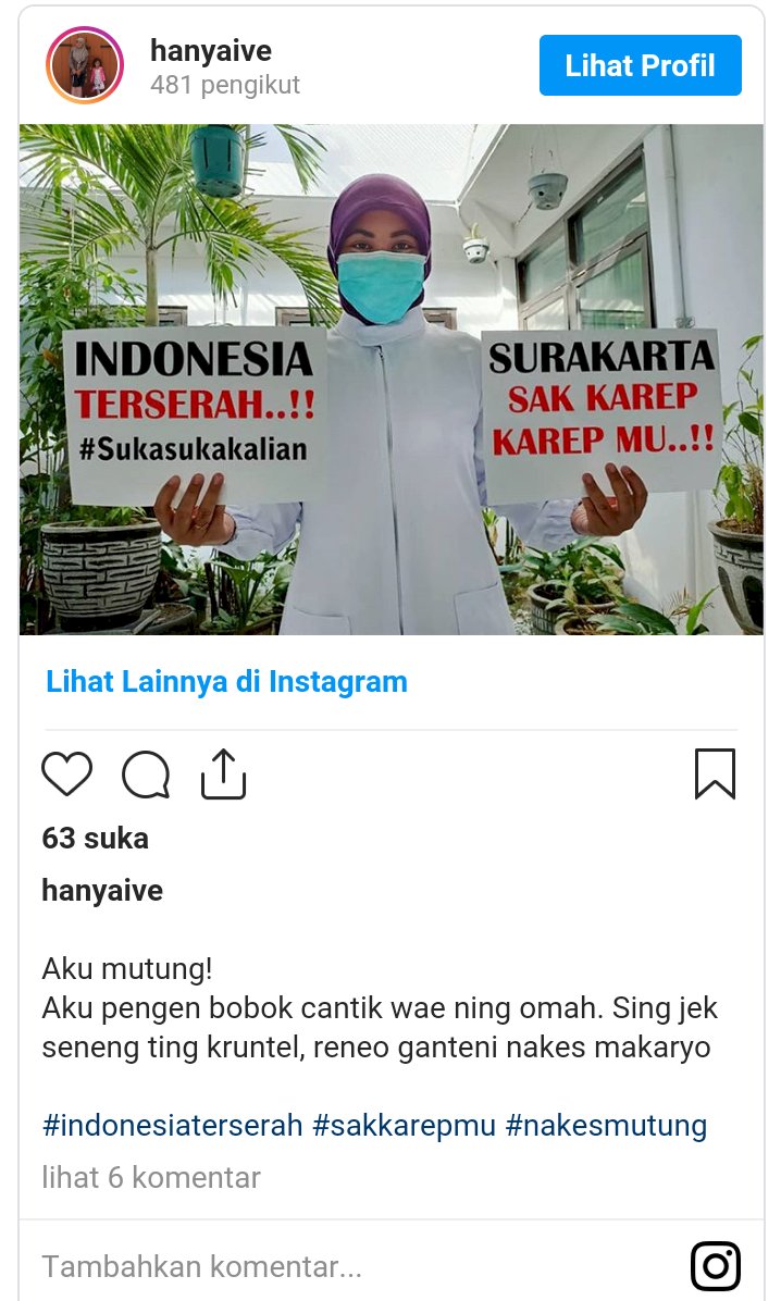 Evi Rismawati, seorang tenaga kesehatan di salah satu puskesmas di Surakarta, Jawa Tengah, ikut membagikan fotonya yang memegang tulisan 'Indonesia Terserah' di akun media sosialnya.