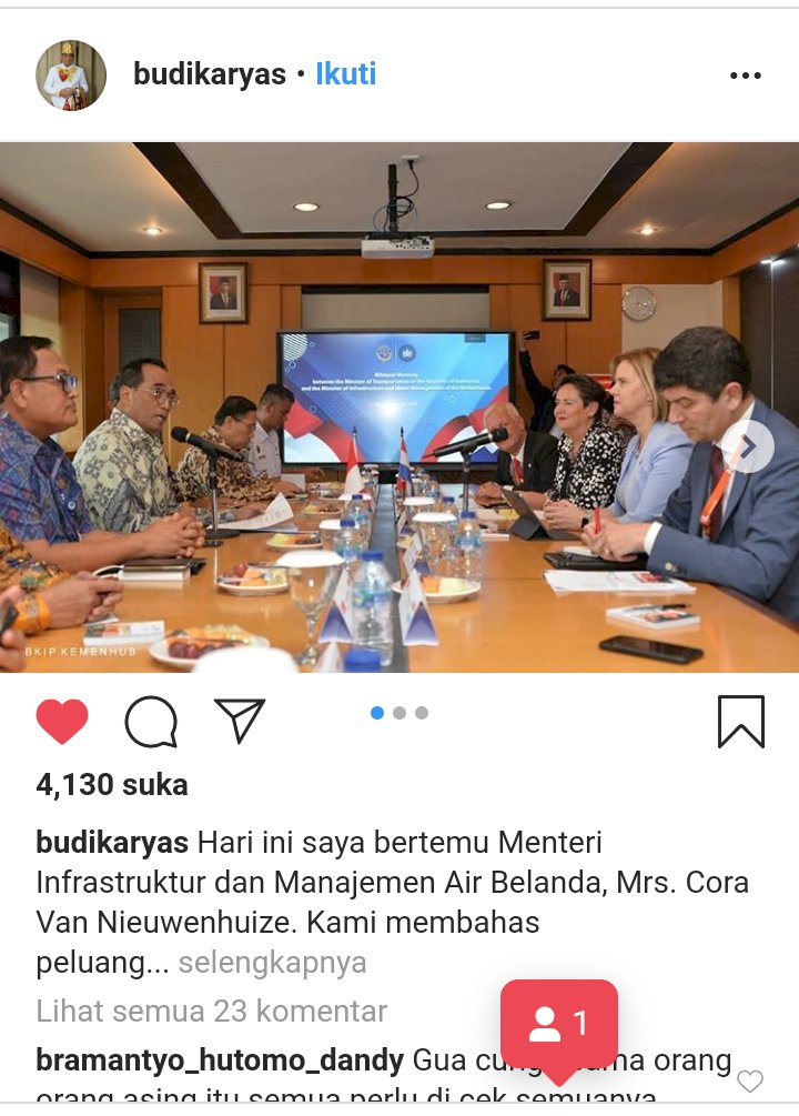 Menteri Perhubungan (Menhub) Budi Karya Sumadi bertemu dengan Menteri Infrastruktur dan Manajemen Air Negara Belanda Mrs Cora Van Nieuwenhuize untuk membahas peluang kerja sama di sektor transportasi. Pertemuan tersebut berlangsung di Kantor Pelindo II, Pelabuhan Tanjung Priok, Jakarta, Rabu (11/3/2020).