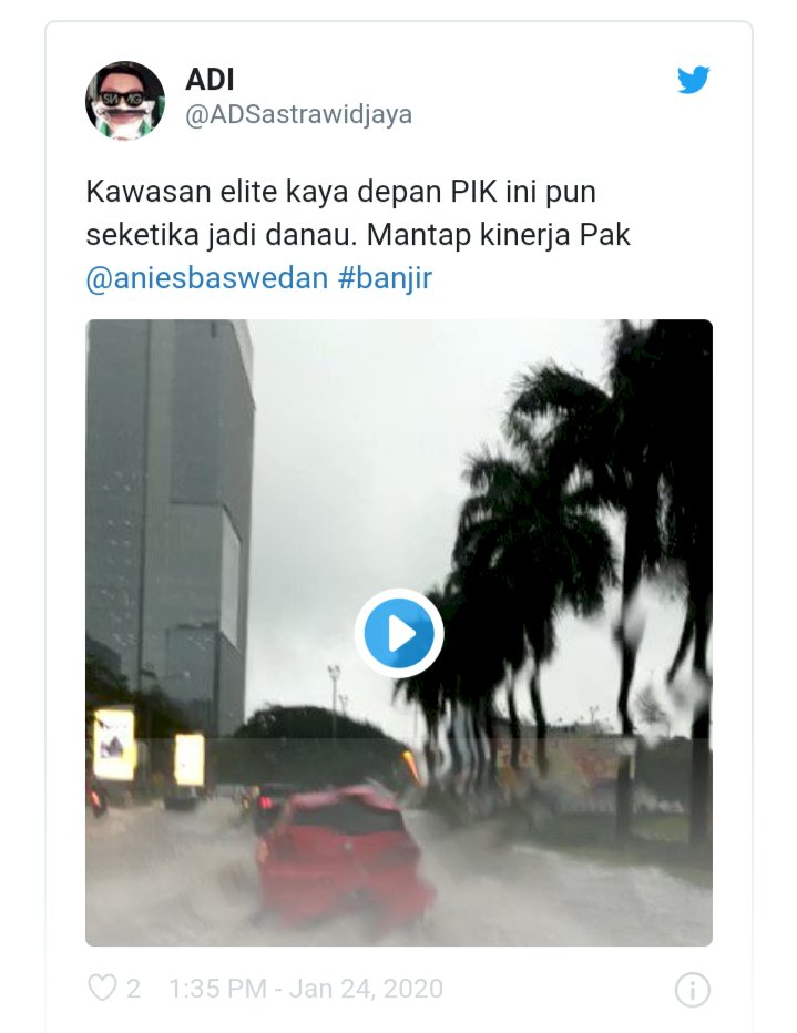 Sementara itu, pengguna lain dengan akun @ADSastrawidjaya mengunggah video jalanan yang mulai terendam banjir. Lokasinya diklaim berada di Pantai Indah Kapuk.