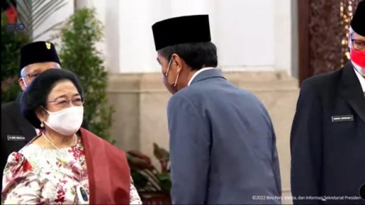 Momen Presiden Jokowi ngobrol dengan Megawati Soekarnoputri penuh tanda tanya. Jokowi juga sempat mengacungkan dua jari saat berbicara dengan Presiden ke-5 RI itu.