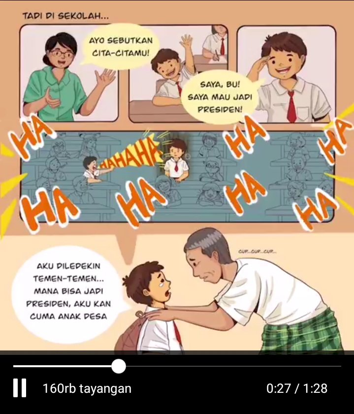 Anak itu lantas menceritakan kenapa dia sampai menangis. Dia mengalami peristiwa tak mengenakkan saat di sekolah. Kala itu, guru menanyakan cita-cita kepada seluruh muridnya. Tanpa malu-malu, anak itu berteriak ingin jadi seorang presiden.