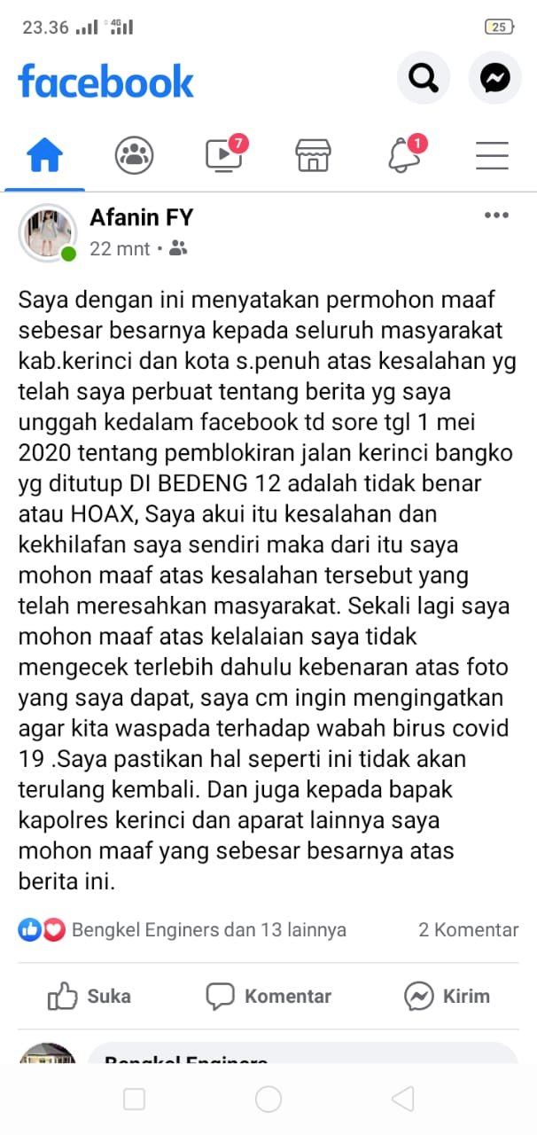 Hingga berita ini diturunkan, akun Afanin Fy telah meminta maaf atas postingan tersebut, dan mengaku khilaf telah menyebarkan kabar bohong.