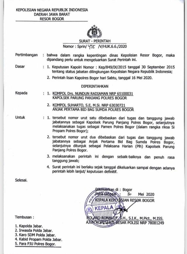 Kapolres Bogor AKBP Roland Rolandy mencopot Kapolsek Parung Panjang Kompol Nundung Radiman, Sabtu (16/5). Pencopotan tersebut tertuang dalam surat perintah dengan nomor Sprin/435/V/HUK.6.6./2020. Jabatan Nundung akan digantikan oleh Kompol Suharto. Dalam surat tersebut, Nundung akan diperiksa Propam Polri.