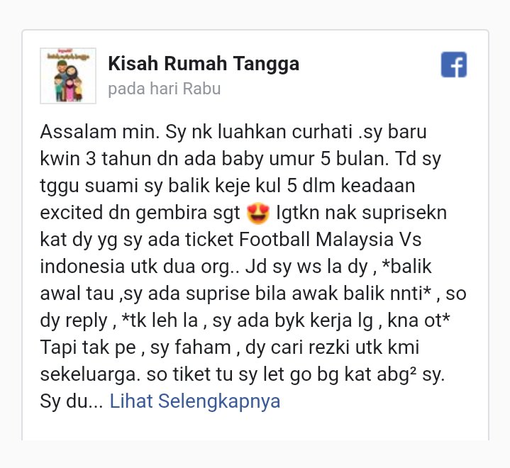 "Sy nk luahkan curhati .sy baru kwin 3 tahun dn ada baby umur 5 bulan. Td sy tggu suami sy balik keje kul 5 dlm keadaan excited dn gembira sgt ???? Igtkn nak suprisekn kat dy yg sy ada ticket Football Malaysia Vs indonesia utk dua org.. Jd sy ws la dy , *balik awal tau ,sy ada suprise bila awak balik nnti* , so dy reply , *tk leh la , sy ada byk kerja lg , kna ot*," tulisnya dalam bahasa Melayu.
